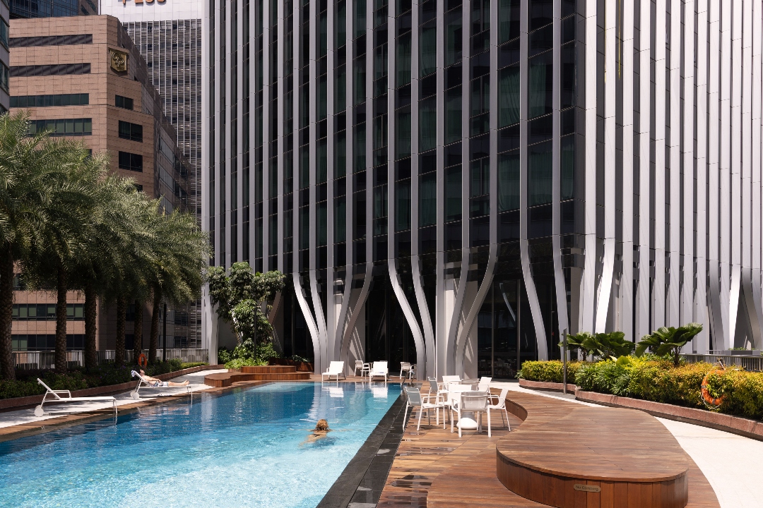 The first eight floors of the tower are dedicated to the serviced residence including a wide range of facilities such as a swimming pool, jacuzzi, jogging track, gymnasium, social kitchen, residents’ lounge, and barbecue pits; the top 29 floors offer premium office spaces with panoramic views of the Singapore River and Marina Bay.