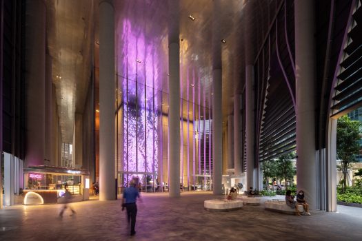 Meandering garden paths create natural entryways into the City Room, an 18-meter-high generous open space at the foot of the tower that creates shelter from the tropical sunlight and showers and welcomes tenants into separate lobbies for the offices and residences, as well as shoppers and diners into the food center within the tower’s podium. The iconic Market Street Hawker Center is recreated at the building’s second and third floors with 56 food stalls – solidifying the location as the beating heart of the city’s culinary experience, and the role it plays in maintaining local culture and community.