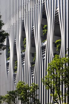 At multiple elevations, the vertical elements comprising the building’s exterior are pulled apart to allow glimpses into the green oases blooming from the base, core, and rooftop “sky garden.” The tower reinforces Singapore’s reputation as a garden city, housing over 80,000 plants, with a Green Plot Ratio of more than 1:1.4 – translating to a total landscaped area of more than 8,300 square meters (90,000 square feet), equivalent to 140% of its site area.