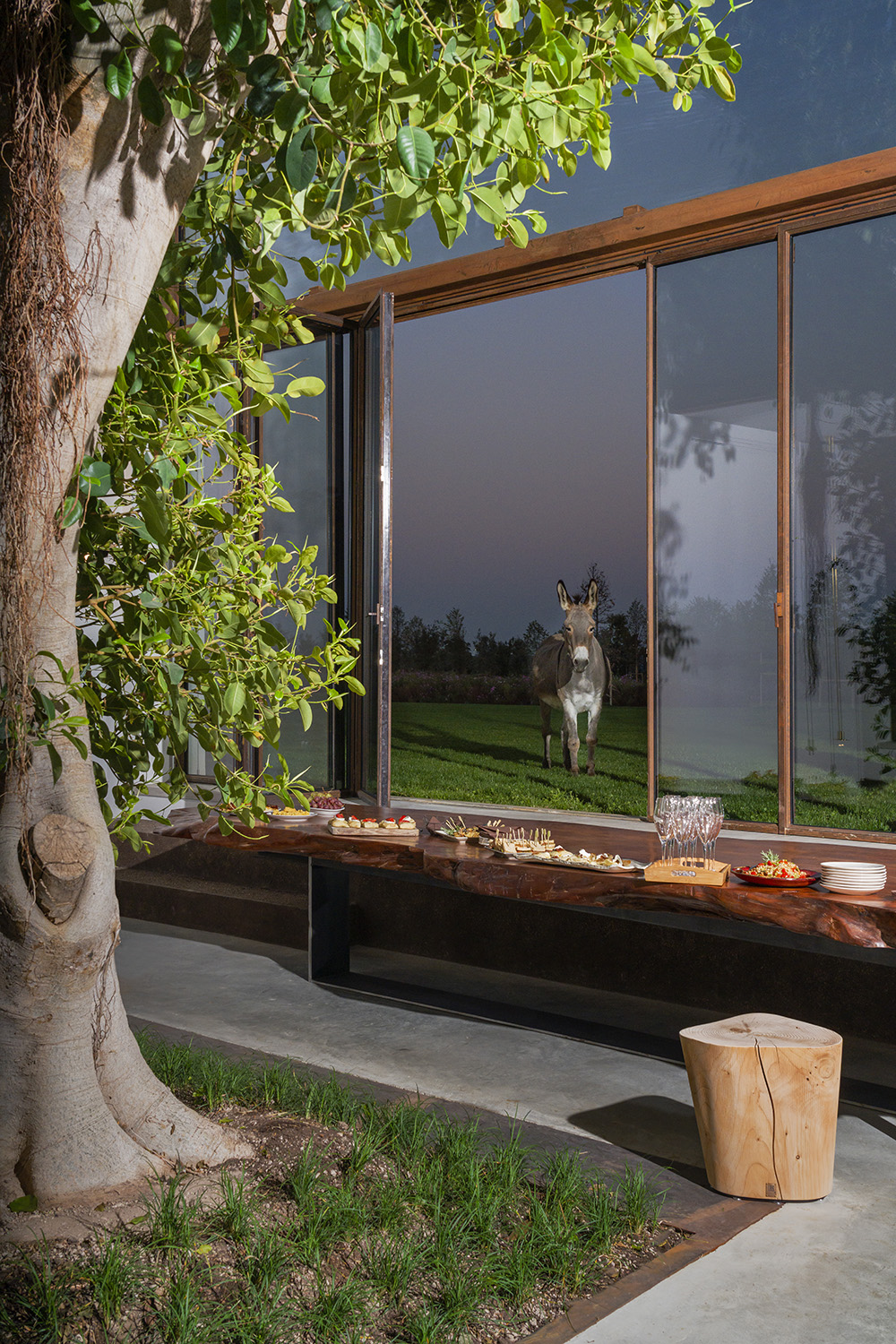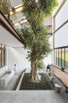 To create the ideal setting for the tree to thrive, CRA has completely redesigned the old farmhouse to maximize natural light, installing a ten-meter-tall, south-facing glass wall. The design harnesses technology and the micro-climate of the surrounding area to control the temperature and humidity, so that the tree and the home’s occupants can live together comfortably. Both the windows and the roof can be opened and closed automatically to adjust the amount of sunlight and fresh air entering the house.