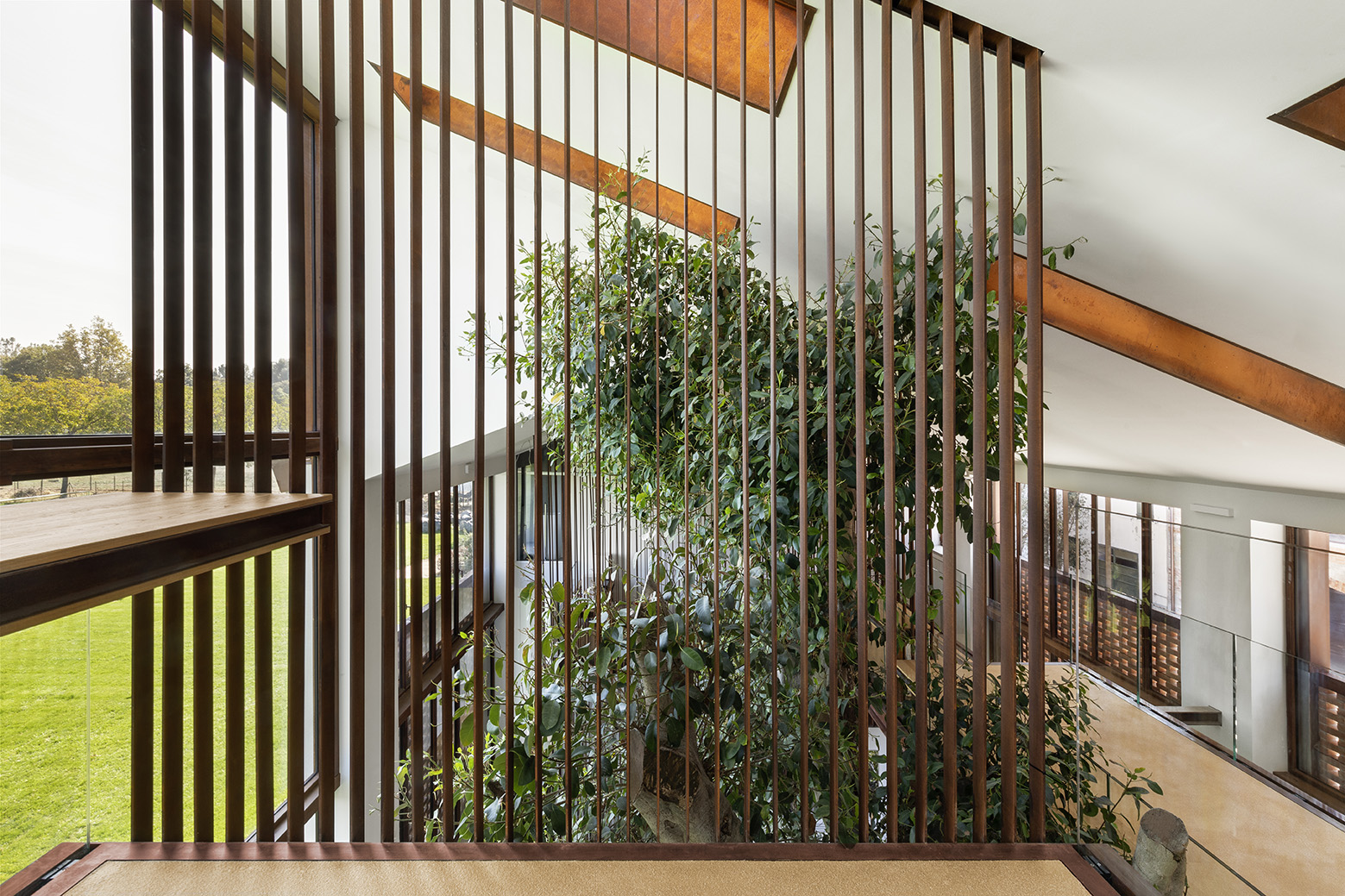 Built out of a traditional Italian farmhouse outside the city of Parma, the Greenary (a wordplay of “green-granary”) responds to the idea of biophilia, a scientific hypothesis proposed by noted biologist and Harvard professor E.O. Wilson, which suggests that human beings share an innate desire to live close to nature. This concept is foremost expressed in the 60-year-old ficus tree named Alma standing in the middle of the living space. It belongs to a species called ficus australis that enjoys stable temperatures all year long and is thus well-suited for indoor living conditions. Its close relative ficus religiosa is venerated by Buddhists as the Bodhi tree, under which Siddhartha achieved enlightenment, while ficus microcarpa adorns the ancient parks across Southern China.